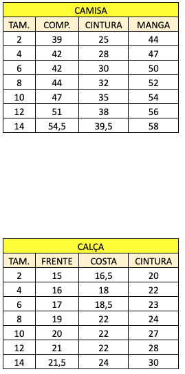 Confira a tabela de medidas abaixo para escolher o tamanho ideal: